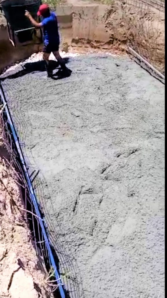 Comienza el llenado de la piscina con agua y grava por fuera. Le echamos arriba hormigón de planta con su zuncho de hierro.
